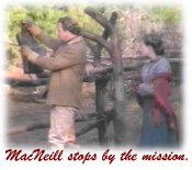 The Details:The only scene between Christy and MacNeill occurs fairly late in the episode, and it is when MacNeill stops by the mission to tend to David's raw hands and to tell the preacher and Christy that Aunt Polly is near death and asking to see them. What we do appreciate about MacNeill here is that where normally he would have been an outspoken critic toward David's disputes with the mountain men, MacNeill wisely lets it go as I suppose he believes David feels bad enough as it is. |